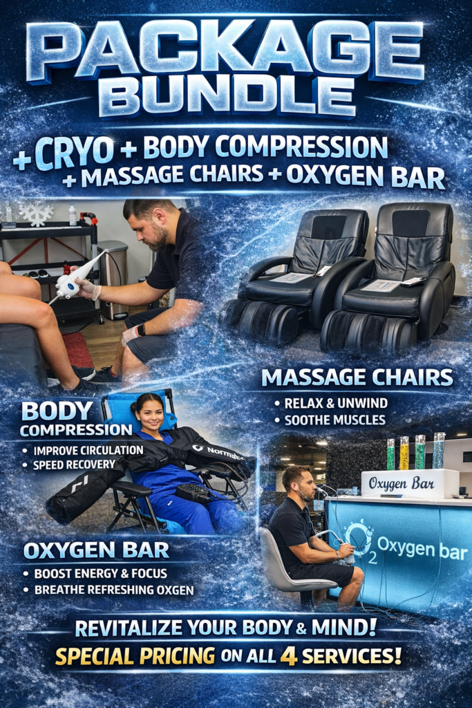 Perfect Pairing → Combine with Massage Chairs and Mobile Oxygen Bars, Body Compression Therapy, Onsite Cryo Therapy 30-60-90 Second Treatments. for a complete wellness lounge.
