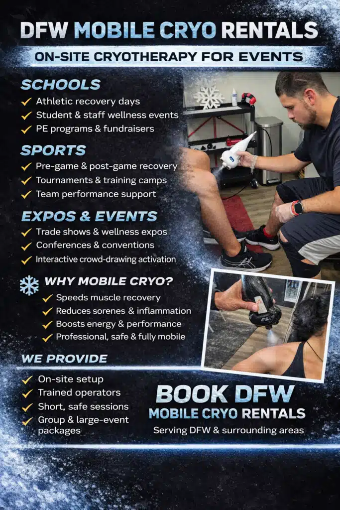 DFW Mobile Cryo delivers fast, targeted cryotherapy directly to your location — perfect for teams, schools, corporate wellness events, and large group activations. Each session provides rapid CO₂ cooling to reduce soreness, decrease inflammation, and boost overall recovery in just 30-60 seconds.